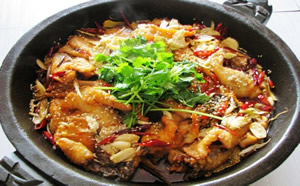 “石锅鱼”也叫“金福鱼”,是湘菜中的一道名菜,制作方法独特,用一块大的花岗岩岩石凿成有双耳的石锅,将鱼放在石锅内烹煎,然后,再加上以辣椒为主的各式佐料,又再加上一些滋补药材制成。清初康熙年间,长沙湘江河畔,有一家小店擅长做一道“石锅鱼”,风味独特。康熙皇帝微服下江南时,在这间小店尝了这道菜,感觉味道鲜美无比,龙颜大悦,故欣然提笔将这道菜赋名为“金福鱼”。此后,“石锅鱼”也就变成“金福鱼”,而这家小店也因此得名为“金福林”。