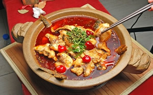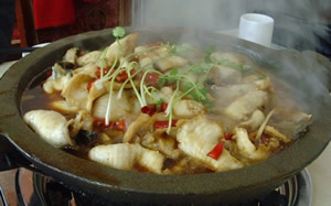 石锅鱼的主料选用草鱼,选料很有讲究。石锅鱼的鱼片刀法要求非常高,刀工好的师傅,切出来的鱼片看上去又长又厚,分量特别多。鱼片在入锅前都必须用油沥过一遍。这时鱼片都卷起来,如果选用的鱼不是鲜活的,那么鱼片都是直直的。等石锅里高汤加热到翻滚,放入鱼片。