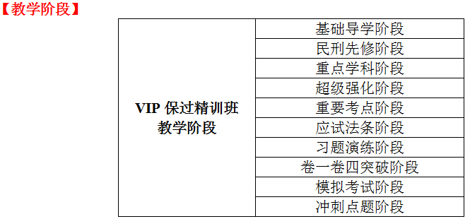 无论任何一个人做任何一件事,终究能否成功不只是取决于想了多少、说了多少,而是取决于努力做到了多少!VIP保过精训班将考生的目标与机构的培训实力和面对司法考试共同的制胜理念转化为实际行动,在落实教学的基础上,强化特色服务,坚持方向至上、吸收至上、心态至上的教学理念,实行辅导老师全程跟踪督学与辅导,充分利用多年授课和服务学员所积累的经验,随时随地解决学员的方法问题、水平问题及应试心态问题,让学员将所学知识及时转化为应试得分能力,为考试排除一切困难。