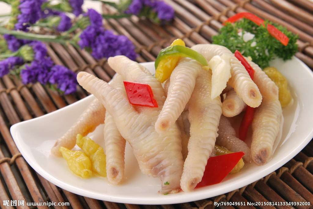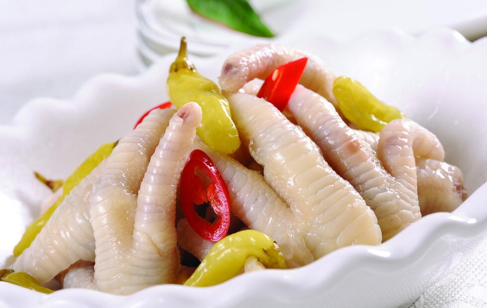 泡椒凤爪是起源于重庆的民间独特美食,属渝菜小吃类。以酸辣爽口、皮韧肉香而著称。泡椒凤爪既能登大雅之堂,也为普通老百姓所喜爱。此款美食具有开胃生津、促进血液循环的功效。制作过程比较讲究,这样才能使泡椒的劲辣味道沁入凤爪中。正宗的泡椒凤爪丰满洁白,咀嚼时骨肉生香,具有很强的催味功效。