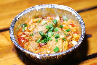 7.麻辣酱的制作:麻辣酱主要用辣椒酱,豆瓣酱加十几种调味料和香辛料熬制而成,酱香浓郁,麻辣适口,用于烤制脑花,鸭肠,鲫鱼等。