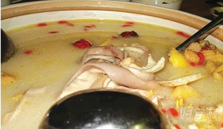 猪肚鸡用料十足,经过十几个小时的熬煮,猪肚、鸡和各种药材及辅料的精华都已溶于汤中,简直就是一锅地道的广东老火靓汤。