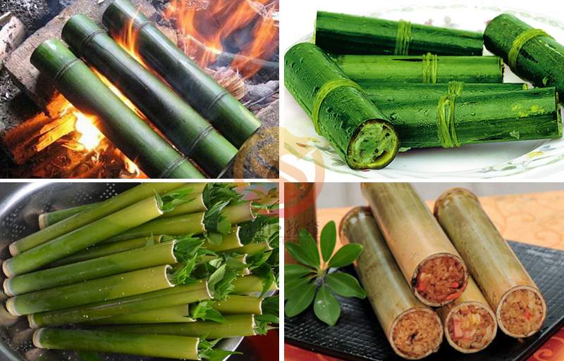 竹筒饭用稻米并配肉类为原料,放进新鲜的粉竹或山竹锯成的竹筒中,加适量的水,再用香蕉叶将竹筒口堵严,炭火中绿竹烤焦或者蒸煮即可。竹筒饭具有野炊特点,即砍下一节竹筒 ,装进适量的米和水,放在火堆中烤熟,当竹筒表层烧焦时,饭就熟了。劈开竹筒,米饭被竹膜所包,香软可口,有香竹之清香和米饭之芬芳。用餐时破开竹筒取出饭,异香扑鼻,是招待贵宾的珍贵美食品,这便是有名的"竹筒香饭"。