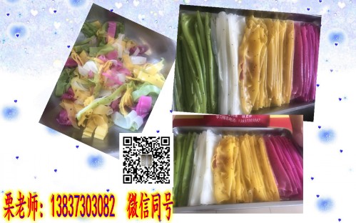 五彩缤纷的彩色凉皮,新颖的创意结合独特的调味,吸引了许多食客。五彩凉皮采用不同的材料制成:绿色的菠菜凉皮,黄色的土豆凉皮,红色的胡萝卜凉皮,黑色的黑米凉皮,白色的大米凉皮。将整张凉皮切成宽条子,可以更好地保持凉皮劲道、弹牙的口感。