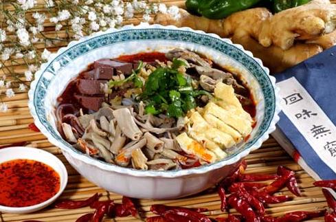 先将鸭血切成薄薄的小方块,鸭肫、鸭肝、鸭肠则经由沸水捞起。尔后鸭肝、鸭肫切成小片状,肠断成小节,粉丝温水烫软备用。鸭肝、鸭肫加入精心熬制的汤底,烧到汤沸成朵朵小花,再加入鸭肝、鸭血、粉丝、水豆腐几小块、姜汁、榨菜少许、白醋和料酒各几滴。然后放入香料包,旺火煮上几分钟,便能起锅盛到大汤碗里。最后撒上切碎的小葱、香菜、胡椒粉,轻轻一搅,热气升腾,香气四溢,保证引得众人垂涎三尺。