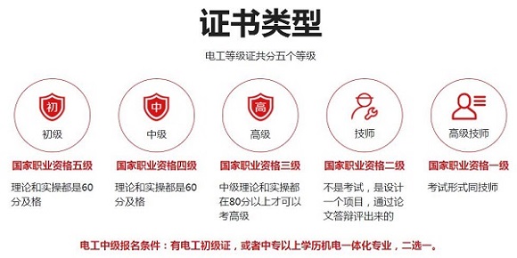 3、职业资格证书:从事职业:电工(俗称等级证),分类:我国职业资格证书分为五个等级:初级(五级)、中级(四级)、高级(三级)三级/高级职业资格证书(英文) 、技师(二级)二级职业资格证书(技师)和高级技师(一级)新版一级职业资格证书 。