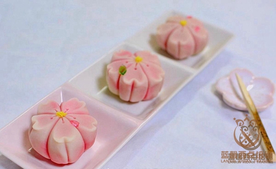 日本皇室在正月会准备用白的圆饼夹有小豆色的菱饼,牛蒡,味曾的“菱葩”。以此为原形设计制作了花瓣饼。