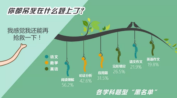 除了超长的写作业时间,图2▼还向我们展示了在具体学科的学习上孩子较怕的题型“黑名单”,比如语文和英语,孩子较怕阅读理解和作文,数学较怕论证题和应用题。