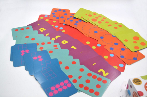 这套数学思维游戏盒一共有红、橙、青、绿、蓝、紫 6种不同颜色的卡片,从0到10不同的呈现方式,帮助孩子理解什么是“数的守恒”。