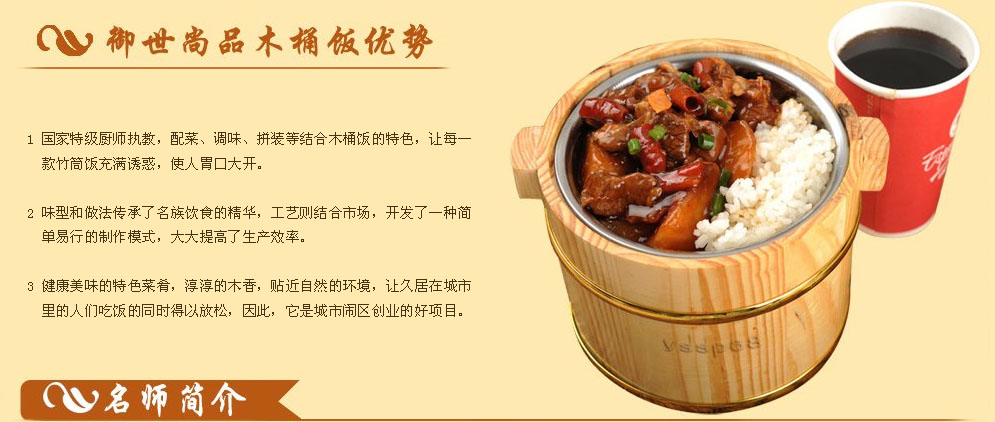 培训内容 | 红烧蹄花木桶饭 ★农家小炒肉木桶饭 ★红烧肉木桶饭 ★玉米丰收木桶饭 ★泡椒小鱼仔木桶饭 ★台湾卤板鸭木桶饭 ★木须肉木桶饭 ★酸辣腰花木桶饭 ★湘味牛腩木桶饭 ★辣子鸡丁木桶饭 ★青豆肉丁木桶饭 ★剁椒鱼头木桶饭 ★黑椒牛柳木桶饭 ★香菇滑鸡木桶饭 ★宫保鸡丁木桶饭 ★鱼香肉丝木桶饭 ★香干回锅肉木桶饭 ★红烧鱼块木桶饭 ★回锅牛肉木桶饭 ★青椒肉丝木桶饭 ★家常豆腐木桶饭等 |
