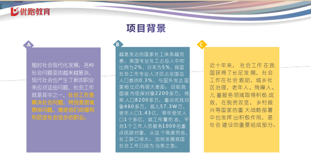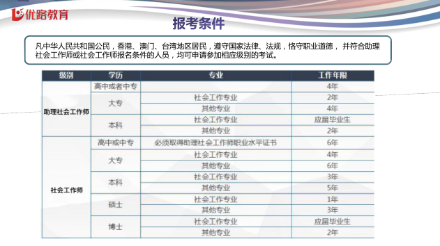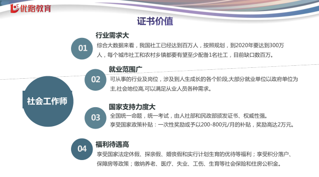 优路教育品牌主要从事工程、财经、教师行业准入类职业(执业)资格认证培训业务、专本科学历继续教育业务。包括:建设工程类执业资格考前培训,如建造师、消防工程师、工程师、造价工程师、监理工程师、咨询工程师(投资)、安全工程师、环境影响评价师等认证培训;财经类职业资格考试培训,如中级经济师、中级会计师、银行招考、银行从业资格、证券从业资格等认证培训;教师类资格考试培训,如教师资格证、教师招聘考试、特岗教师考试等。