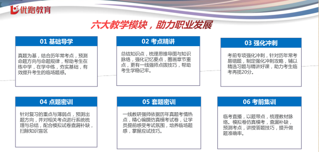 优路教育采用线下面授和线上网络教育相结合的模式,凭借科学的课程体系、专业的教研团队、强大的师资力量、完善的服务团队及个性化的服务体系,每年帮助数万名考生顺利通过了考试。
