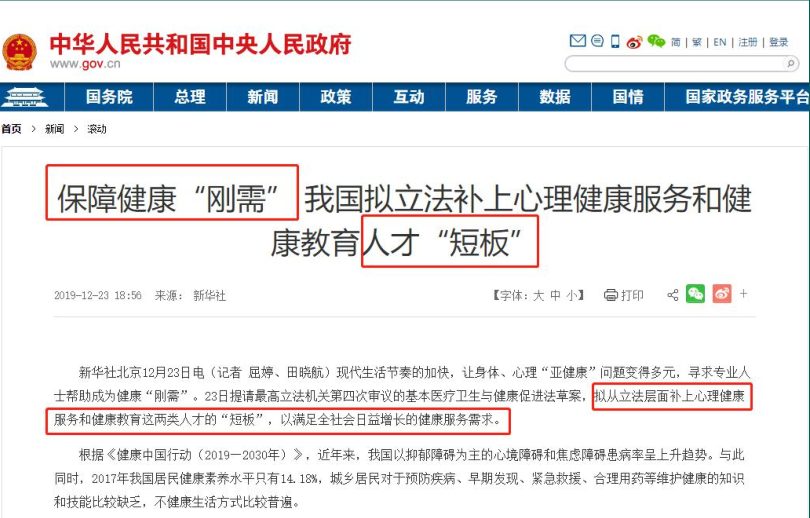 当前,全社会对心理健康服务、健康科学知识有巨大的需求,但相关专业人才无论在数量还是质量上还存在“短板”。对此,基本医疗卫生与健康促进法草案增加规定,提出国家加强心理健康服务人才