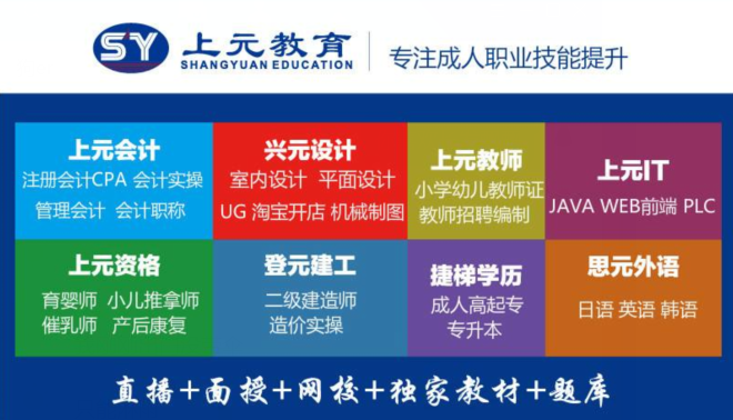 上元常年开设课程有:会计上岗证、做账实操、会计实务等财务培训课程;报关员、报检员、单证员等外贸培训课程;平面设计、室内设计、网页设计、动漫设计、服装设计等电脑艺术设计培训课程;商务办公文秘、网络管理、计算机等级考试等电脑培训课程;机械、模具设计培训课程;单片机、PLC、建筑弱电等自动一体化培训课程;造价员和造价员实操培训覆盖了土建、安装、装饰、园林、市政等五大预算培训课程,建筑工程类的课程还有一级建造师、二级建造师培训;国家职业资格类培训主打课程有企业人力资源管理师、公共营养师、物流师、计算机辅助设计、电子商务师五大项目;外语开设了商务与等级考试相结合的英、日、韩语培训,特别推出了德、法、西班牙等小语种;此外还开设了书法、美术、舞蹈、插花等少儿、青少年及成人才艺培训系列课程,常年接受大专、本科学历咨询报名工作。