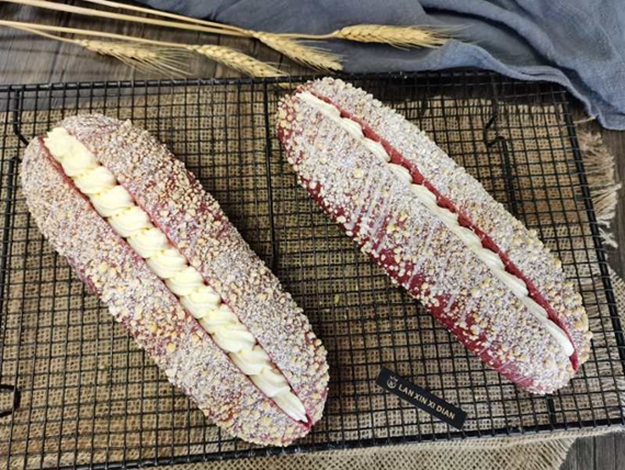 6、分割面团,200g/个把分好的小面团整形光滑 喷水,使表面有湿润感放置10分钟 然后将面团擀开成长条形 翻面,光滑面朝下 铺上奶酪丁,撒核桃碎 从上至下将面团卷起,收口朝下 (生核桃碎建议提前入烤箱100°C烤20分钟。