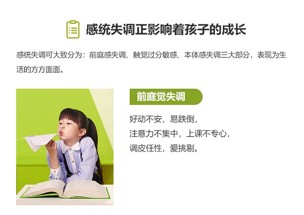 感统失调可大致分为:前庭感失调、触觉能力不佳、本体感失调三大部分,表现为生活的方方面面。