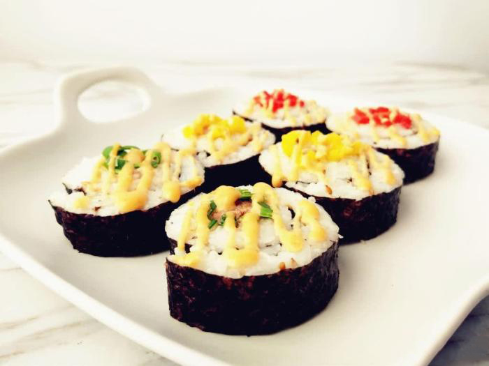 每个寿司上都有咸萝卜和红椒做点缀,色泽瞬间艳丽很多,仅仅只是看着它就让人食欲满满!软糯的口感中又带着一丝丝的清脆,品尝一口,这口感让人回味无穷,难以抵抗不得不爱。