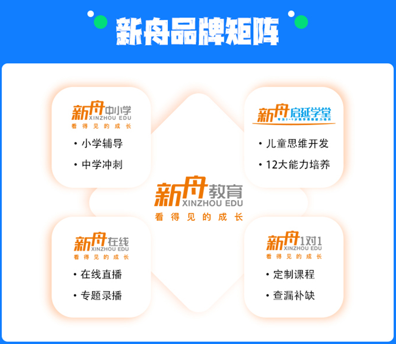 上海新舟教育培训有限公司是一家行业卓越的教育培训企业,以品质卓越、家校结合、扎根社区、开放式教学作为企业发展的核心目标。自创立以来,一直致力于为沪上学子提供家门口的一站式教育培训服务,利用全市范围内更优质的教师资源和一线的教学资讯,结合现代化的教学技术和手段,在素质教育与趣味教育的基础上帮助学员掌握高效学习方法和快速提高成绩。因为专注,所以我们专业。办学五年来,新舟专注于幼儿及中小学培训领域,现拥有五大业务模块:智多多乐园、小学课程、中学课程、竞赛课程、尚精一对一。2014年,新舟年培训学员超过6000人次,成果斐然,小升初和中考成绩也是喜讯不断,被名校录取学员人数连续三年稳步增长,教学质量享誉沪上,社会影响力不断扩大,被家长圈誉为“更具口碑的中小学辅导品牌”。